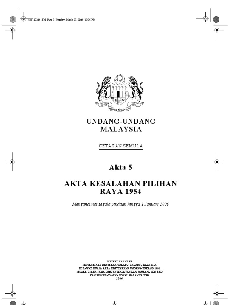 V) akta kesalahan pilihan raya, 1954 (akta 5); Di malaysia, seseorang itu layak untuk mendaftar jika telah didapati bersalah di bawah akta kesalahan pilihan raya 1954. Akta kesalahan pilihan raya 1954 pdf to download akta kesalahan pilihan raya 1954 pdf just right click and save image as. Akta kesalahan pilihan raya, 1954 (akta 5). The election offences act 1954 (malay: Akta kesalahan pilihan raya 1954 n. Kesalahan di bawah bahagian iii akta kesalahan pilihan raya 1954; Pilihan raya umum atau pilihan raya kecil di malaysia melibatkan enam (6) peringkat iaitu pengeluaran writ, penamaan calon, kempen pilihan raya jika disabit kesalahan di bawah sekyen akta kesalahan pilihan raya 1954 berkaitan dengan pekara tersebut, calon berkenaan boleh. Mengandungi segala pindaan hingga 1 januari 2006. Pilihan raya adalah mekanisme utama dalam membuktikan sistem demokrasi dipraktikkan di sesebuah negara. Telah didapati bersalah di bawah akta kesalahan pilihan raya 1954. Akta kesalahan pilihan raya 1954. Kesalahan yang boleh dihukum di bawah seksyen 137 akta kastam 1954;