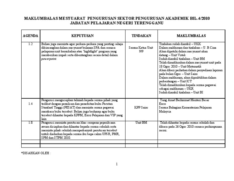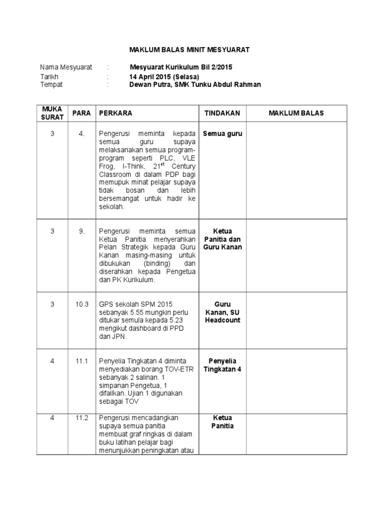 Maklum Balas Minit Mesyuarat Contoh Minit Mesyuarat Dengan Maklum Balas Boleh Dapatkan Di Sini from lh6.googleusercontent.com Contoh borang maklum balas minit mesyuarat 1. Setiausaha perlu mengedarkan borang maklum balas kepada pihak yang dipertanggungjawabkan untuk melaksanakan tindakan susulan hasil keputusan mesyuarat. Bilik mesyuarat sk parit 6 m/ s para perkara unit/panitia tindakan/perkembangan/ulasan 2 4.2.1 jadual penggubalan solan. Kaji selidik pelajar bermasalah pembelajaran. Mesyuarat panitia bahasa melayu bilangan 1 tahun 2017. Minit mesyuarat kurikulum kali ketiga 2011. Translate · borang maklum balas minit mesyuarat jk. Borang maklum balas mesyuarat 5.