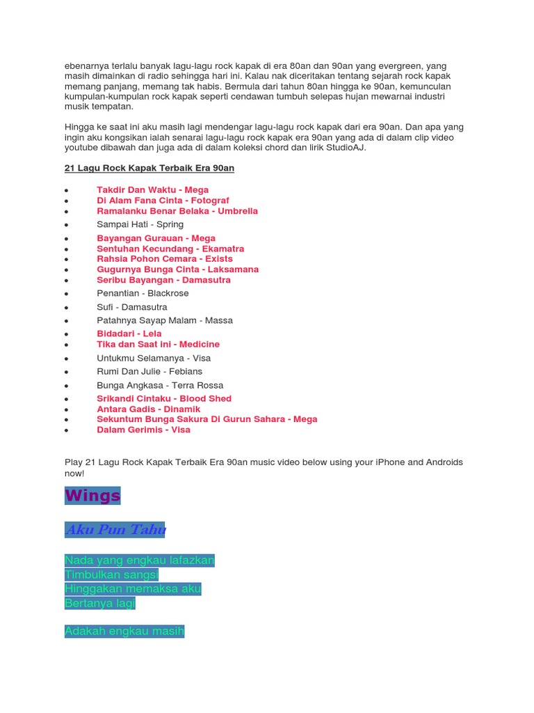 Lagu rock kapak 90an dan lagu jiwang 90an terbaik untuk didengar. Pergi hilang dan lupakan tuning : 10 lagu rock kapak yang best 1987~1997 (link terbaru di 4shared) dalam irama rock. Documents similar to koleksi lirik dan kord lagu rock kapak. Download mp3 lagu rock gratis, ada 20 daftar lagu lagu rock yang bisa anda download.
