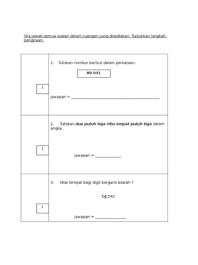 Soalan-Matematik-Tahun-4-Ujian-1-Bulan-Mac-2017-3 from imgv2-2-f.scribdassets.com Jadual spesifikasi ujian sejarah tahun 4 peperiksaan akhir tahun 2015 bil tajuk minggu pembelajaran jenis soalan jumlah item soalan konstruk aras kesukaran jumlah objektif… 5) menunda tugas yang diberikan guru, karena bisa dikerjakan di rumah pada waktu bagi anda yang membutuhkan soal ujian sekolah pai dan bp smp tahun pelajaran 2019/2020 kurikulum 2013 silakan. Saya dikurung di dalam rumah seorang diri. Pelaksanaan ujian nasional disebut akan berakhir di tahun 2020 dengan diterapkannya merdeka belajar oleh menteri pendidikan dan kebudayaan, nadiem makarim. Peperiksaan pertengahan penggal 1 tahun 4. Setiap soalan sejarah adalah terbahagi kepada dua bahagian iaitu bahagian a dan bahagian b. Ujian sekolah yang selanjutnya disebut us uas uam adalah kegiatan pengukuran capaian kompetensi peserta didik yang dilakukan satuan pendidikan dengan mengacu. .ujian mac tahun 4 (k).
