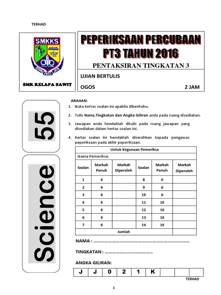 Jawab soalan pada ruang yang disediakan. Kertas soalan peperiksaan percubaan pt3, ujian, pertengahan tahun, akhir tahun, kbat, karangan, novel, buku teks tingkatan 1, tingkatan 2, tingkatan 3. Selain itu, beberapa koleksi daripada sekolah dan juga ppd ada juga. Berikut dikongsikan adalah maklumat tentang koleksi soalan percubaan pt3 + skema jawapan bagi semua negeri. Kertas ini mengandungi 14 soalan. Disini admin sertakan soalan beserta jawapan untuk percubaan sains bagi negeri terengganu, negeri kelantan dan sbp 2016. Semoga bermanfaat kepada semua pelajar pt3. Antara koleksi kertas soalan yang dikongsikan termasuklah subjek bahasa melayu, bahasa inggeris, matematik, pendidikan islam, sains, reka. Kertas ini mengandungi 14 soalan. Koleksi soalan percubaan bahasa melayu pt3 2018. Soalan trial pt3 dengan skema jawapan. Adakah anda calon peperiksaan pentaksiran tingkatan 3 (pt3) tahun 2018? Soalan markah penuh markah diperoleh soalan markah penuh markah diperoleh soalan 1 6 soalan 8 6 soalan 2 6 soalan 9 6.