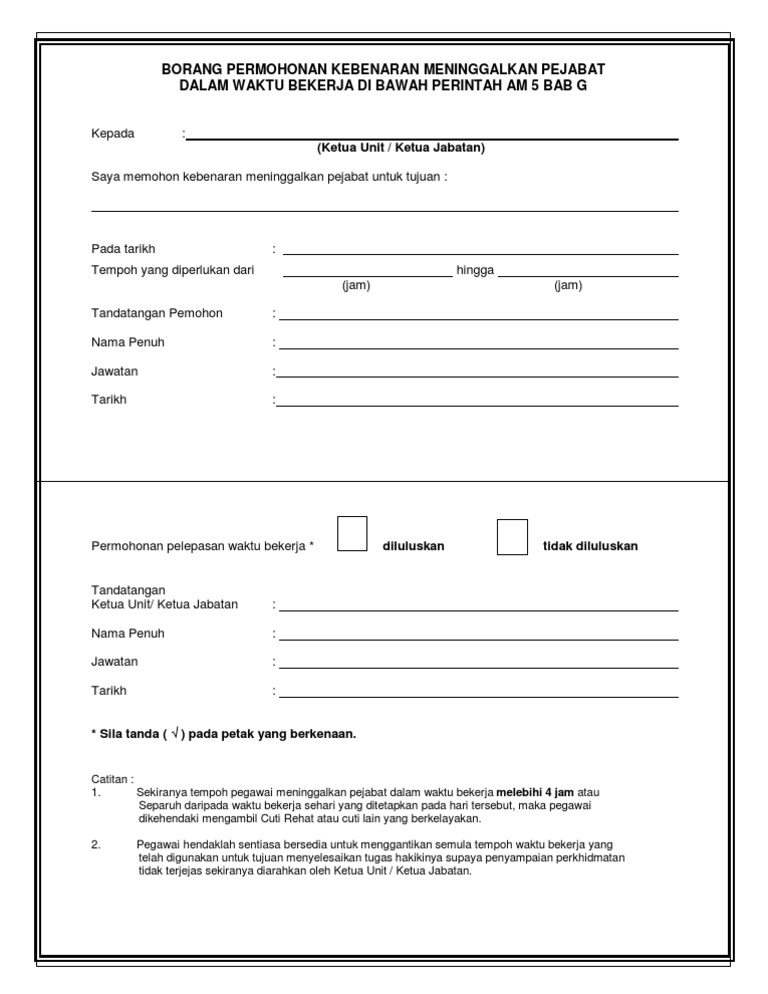 Bahagian sumber manusia, pejabat pendaftar tarikh : 11, persiaran klcc, 50088 kuala lumpur, malaysia. Sekiranya tempo h pegawai meninggalkan pejabat dalam waktu bekerja melebihi 4 jam atau separuh daripada waktu bekerja sehari yang ditetapkan pada hari tersebut maka pegawai dikehendaki mengambil cuti rehat atau cuti lain yang berkelayakan. Sekiranya ketua jabatan telah memberi kelulusan keluar pejabat antara pukul 7 30 pagi hingga 9 00 pagi tempoh kebenaran pelepasan hanya akan diambil kira mulai pukul 9 01 pagi sekiranya pegawai tidak mengetik masuk pejabat dan waktu pulang pegawai pada hari tersebut ialah pada pukul 6 00 petang. Borang laporan menghadiri program anjuran luar: _____ nsa/fmd/csf/borang keluar waktu pejabat/pool computer/csf Sekiranya tempoh pegawai meninggalkan pejabat dalam waktu bekerja melebihi 4 jam atau separuh daripada waktu bekerja sehari yang ditetapkan pada hari tersebut, maka pegawai dikehendaki mengambil cuti rehat atau cuti lain yang berkelayakan. Borang permohonan kebenaran keluar 4 jam docx lampiran a kebenaran untuk meninggalkan pejabat dalam waktu bekerja di bawah perintah am 5 bab g borang course hero kebenaran untuk meninggalkan pejabat kebenaran meninggalkan pejabat dalam waktu bekerja Borang permohonan kebenaran keluar 4 jam docx lampiran a kebenaran untuk meninggalkan pejabat dalam waktu bekerja di bawah perintah am 5 bab g borang course hero. Borang permohonan kebenaran keluar 4 jam docx lampiran a kebenaran untuk meninggalkan pejabat dalam waktu bekerja di bawah perintah am 5 bab g borang course hero. Lembaga kemajuan tanah persekutuan, menara felda, platinum park, no. Borang kebenaran keluar pejabat dalam waktu bekerja. Kebenaran untuk meninggalkan pejabat dalam waktu bekerja di bawah perintah am 5 bab g borang permohonan kebenaran meninggalkan pejabat dalam waktu bekerja kepada: