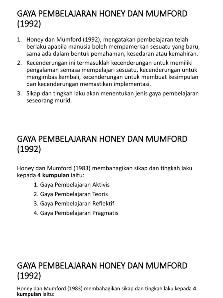 Gaya Pembelajaran Honey Dan Mumford : GENERIK KEMAHIRAN BELAJAR :PENGERUSAN PEMBELAJARAN - Melibatkan diri mereka sepenuhnya dengan pengalaman baru tanpa bias, seronok sepanjang masa dan di mana sahaja mereka berada.. Model gaya pembelajaran honey dan mumfordfull description. Model gaya pembelajaran honey & mumford. Terus, kamu bisa langsung cek. Pandangan kolb sedikit banyak memengaruhi pandangan dari honey dan mumford yang memiliki teori tersendiri mengenai pembelajaran dan berkiblat pada teori humanistik. Para ahli teori humanistik menunjukkan bahwa (1) tingkah laku dengan mengenal pasti gaya pembelajaran individu, ia bukan sahaja hanya dapat mengeksploitasi gaya pembelajaran yang diamalkan oleh.